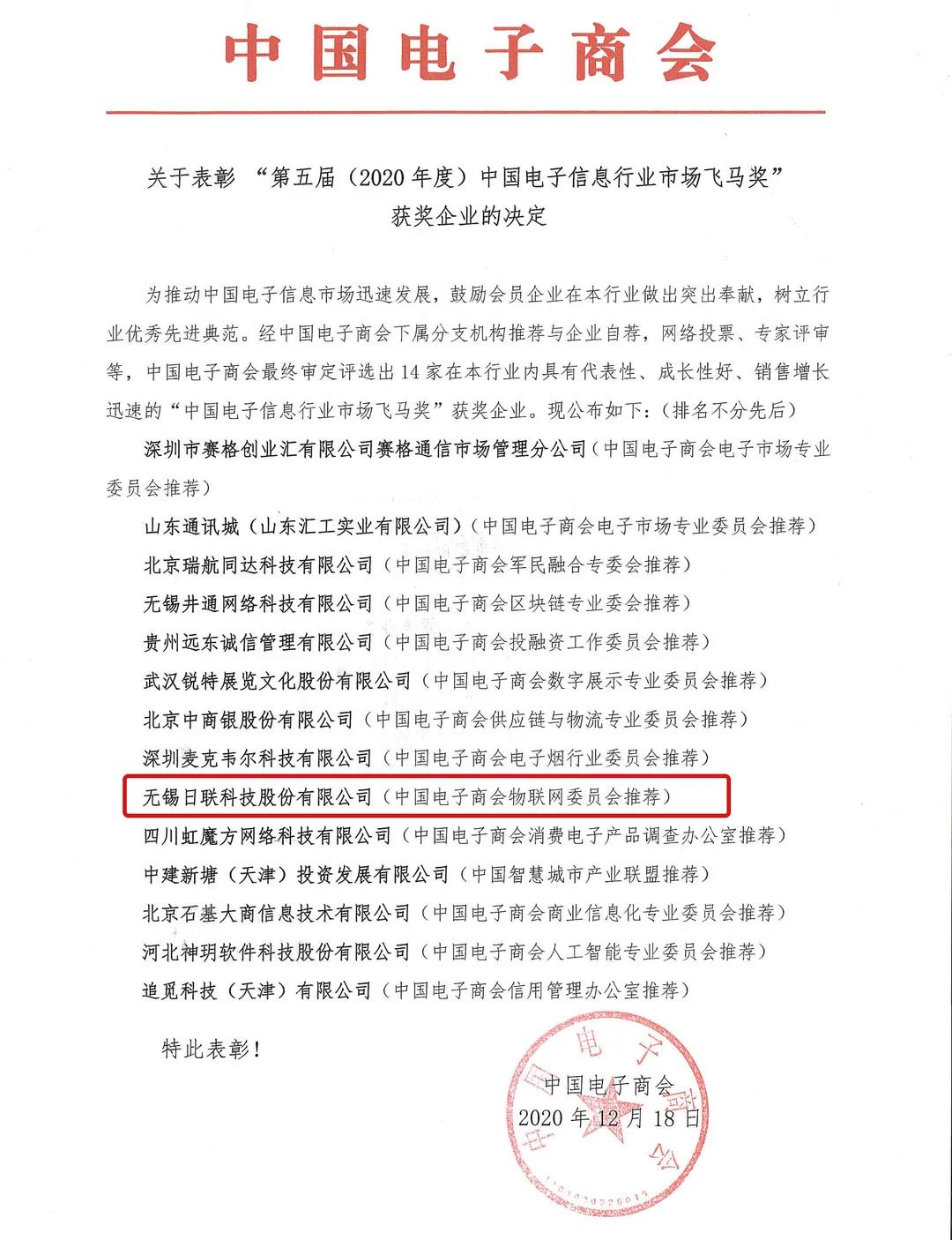 2020年12月18日,第五屆(2020年度)中國電子信息行業(yè)市場飛馬獎評選隆重揭曉,這是中國電子商會年度評選的**獎項,日聯(lián)科技榮譽(yù)在列。