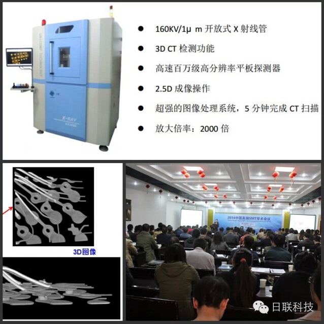 作為電子制造業(yè)X射線智能檢測裝備領(lǐng)航者,日聯(lián)科技受邀參會(huì),西北片區(qū)經(jīng)理劉嵐發(fā)表題為《X射線3D 智能檢測技術(shù)》之專題報(bào)告。眾所周知,隨著電子產(chǎn)品集成度越來越高、元器件的封裝越來越小、且在板上的分布密度愈來愈密,其生產(chǎn)加工工藝變得愈加復(fù)雜,焊接質(zhì)量的保障迎來新的挑戰(zhàn),加之傳統(tǒng)的表面光學(xué)檢查及ICT測試都有各自的檢測盲區(qū),因此具有穿透檢測功能的X光檢查作為電子產(chǎn)品質(zhì)量檢測必不可少的關(guān)鍵技術(shù)就顯得尤為重要。特別是當(dāng)今智能電子產(chǎn)品上廣泛使用的PoP疊層封裝焊接質(zhì)量檢測,具有3D CT功能的X射線智能裝備就大顯神通了。報(bào)告中重點(diǎn)介紹X射線的激發(fā)/成像原理、三維CT技術(shù)的檢測優(yōu)勢、以及結(jié)合日聯(lián)科技**研發(fā)的國內(nèi)首臺(tái)160KV/1μm微聚焦3D CTX-ray機(jī)器AX3000的智能檢測技術(shù)及優(yōu)越的軟件性能給聽眾進(jìn)行一一報(bào)告。為廣大電子制造企業(yè)提供工藝優(yōu)化和質(zhì)量提升的新技術(shù)和新方案,受到現(xiàn)場嘉賓的廣泛關(guān)注。