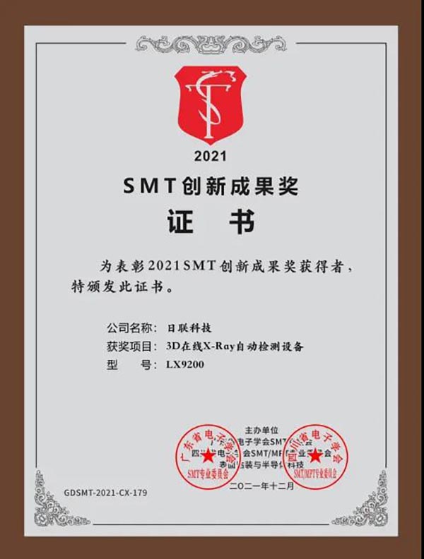 在中國(guó)SMT創(chuàng)新成果頒獎(jiǎng)典禮上,日聯(lián)科技研制的LX9200在線(xiàn)X射線(xiàn)自動(dòng)檢測(cè)裝備憑借重大技術(shù)創(chuàng)新點(diǎn)及行業(yè)專(zhuān)家學(xué)者一致評(píng)定,榮獲“2021中國(guó)SMT創(chuàng)新成果獎(jiǎng)”,這也是日聯(lián)科技連續(xù)12年獲得該獎(jiǎng)項(xiàng)。