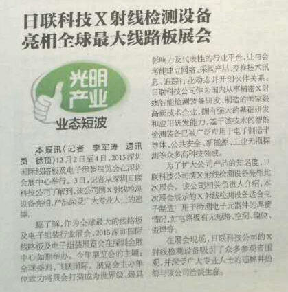 本次展會(huì)議題深入探討了智能自動(dòng)化及工業(yè)制造4.0,由行業(yè)專家分享革新趨勢(shì)資訊及實(shí)用解決方案。日聯(lián)科技時(shí)刻緊跟科技步伐,公司所有X-ray檢測(cè)設(shè)備進(jìn)行全面升級(jí),全部配置智能化檢測(cè)軟件及云端后臺(tái)監(jiān)控系統(tǒng),完成智能制造產(chǎn)業(yè)的快速轉(zhuǎn)型。未來日聯(lián)科技繼續(xù)堅(jiān)持走技術(shù)創(chuàng)新可持續(xù)發(fā)展道路,加快國際化的接軌。同時(shí),吸收各行業(yè)人士提出的寶貴建議,多年以來為能爭(zhēng)取到各行業(yè)同仁的認(rèn)可和友誼而感到高興。2015年馬上就要接近尾聲,日聯(lián)科技再次感謝各位行業(yè)同仁及客戶長(zhǎng)期以來對(duì)公司的關(guān)心與支持,我們會(huì)提供更優(yōu)質(zhì)的產(chǎn)品服務(wù),期待更加精彩的2016年!