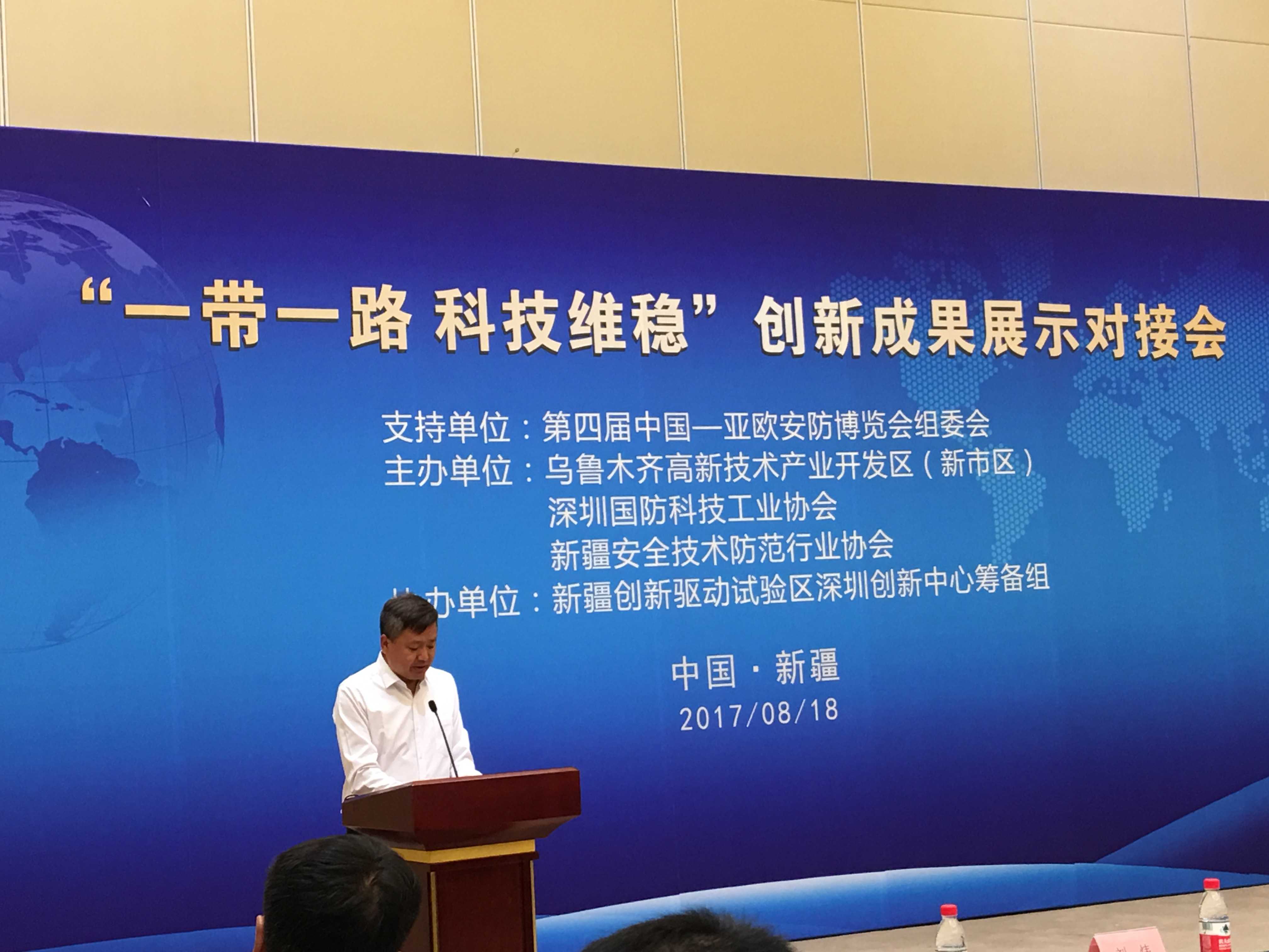 展會(huì)期間,烏魯木齊高新區(qū)(新市區(qū))政府協(xié)同深圳國(guó)防科技工業(yè)協(xié)會(huì)、新疆安防協(xié)會(huì),于8月18日在會(huì)展中心5樓多功能廳聯(lián)合舉辦了“一帶一路·科技維穩(wěn)”創(chuàng)新成果展示對(duì)接會(huì)。自治區(qū)政法委、公安廳及監(jiān)獄局等領(lǐng)導(dǎo)、深圳對(duì)口援疆前方指揮部領(lǐng)導(dǎo)、陸軍邊海防學(xué)院烏魯木齊校區(qū)相關(guān)專(zhuān)家、烏魯木齊公安政法系統(tǒng)相關(guān)主管部門(mén)以及行業(yè)協(xié)會(huì)、深圳22家軍民融合高新技術(shù)企業(yè)負(fù)責(zé)人等150多人進(jìn)行了交流對(duì)接。日聯(lián)科技董事長(zhǎng)劉駿先生代表深圳22家企業(yè)向參會(huì)領(lǐng)導(dǎo)發(fā)言表態(tài),將持續(xù)向反恐一線提供高、精、尖、端反恐技術(shù)及裝備產(chǎn)品并全力配合國(guó)家及自治區(qū)政府打好反恐維穩(wěn)人防及技防的“組合拳”,奪取反恐維穩(wěn)斗爭(zhēng)的全面勝利。